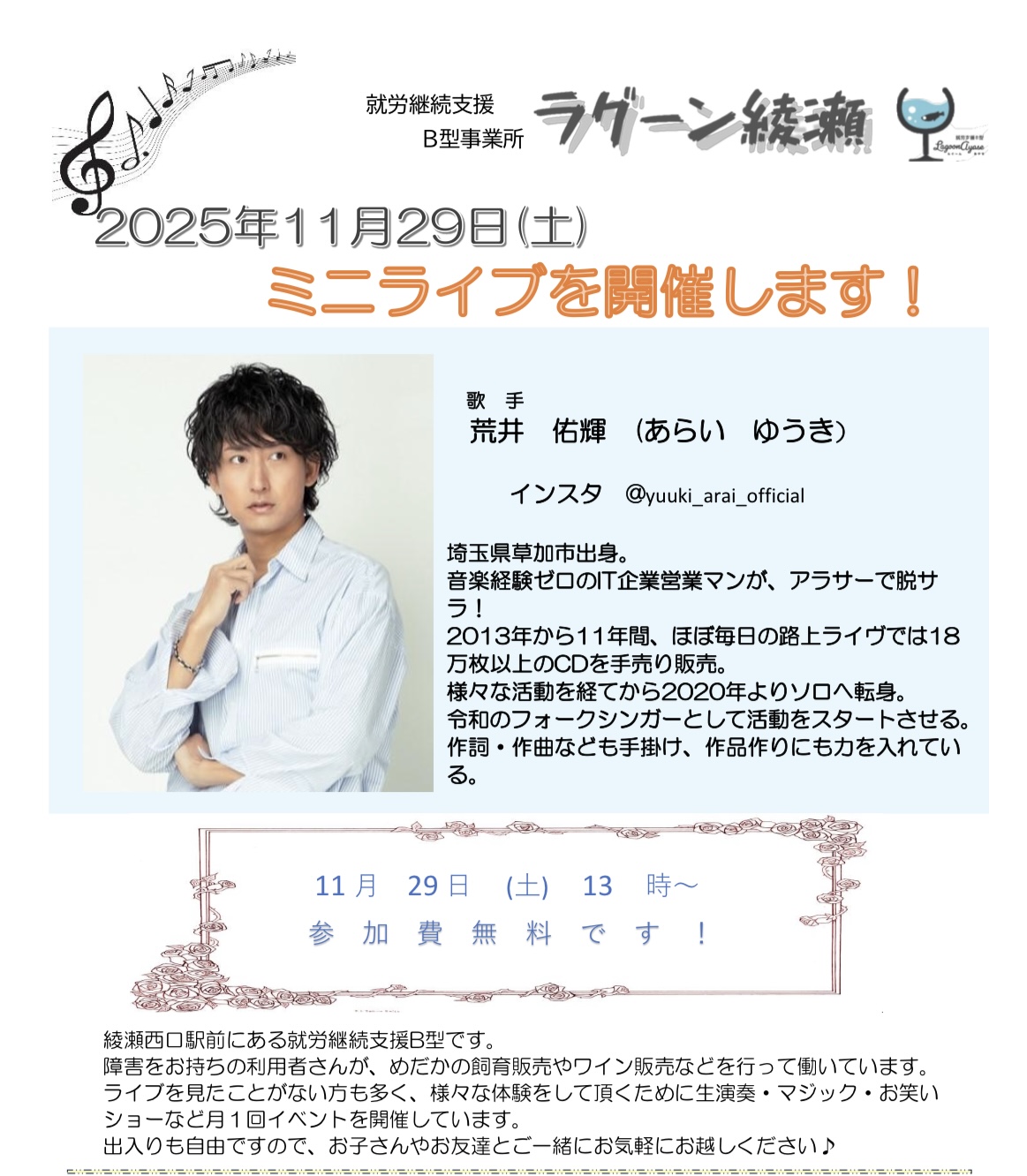 荒井佑輝さんによるミニライブを開催します☆